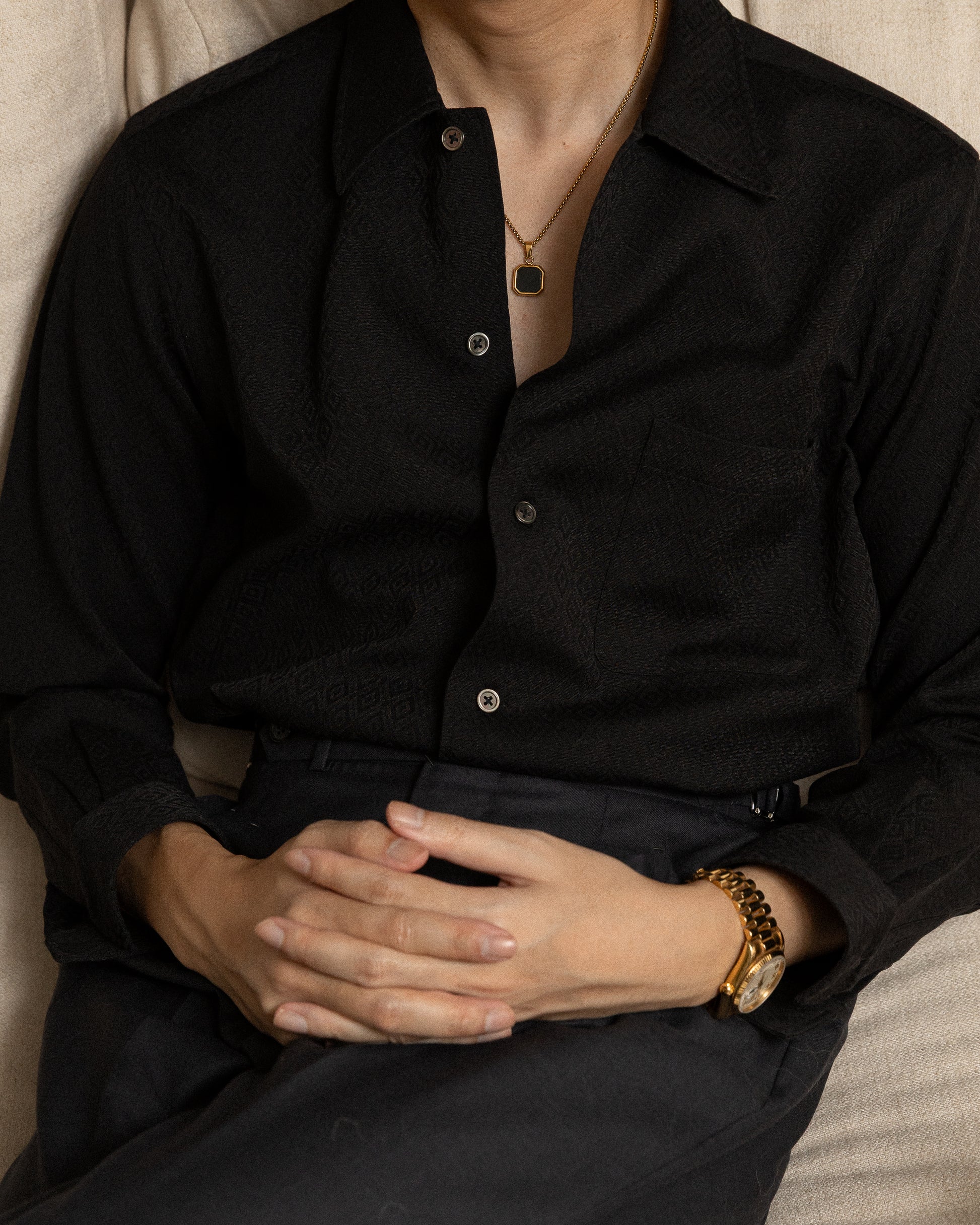 Deep black, calm and confident.